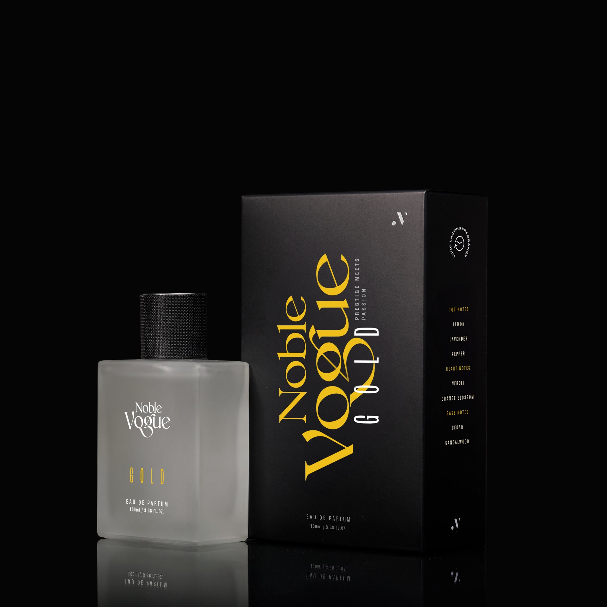 Encased in an elegantly designed bottle, Noble Vogue Gold is a true symbol of luxury. Its sleek, sophisticated packaging reflects the richness of its golden essence, making it a perfect addition to any collection.